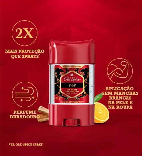 Experimente um toque de exclusividade com o desodorante antitranspirante em gel Old Spice VIP! Sinta-se protegido contra o suor e o mau cheiro e enfrente seus desafios com mais confiança, graças a sua aplicação sem manchas brancas e aroma frutado com notas verdes e especiarias.
